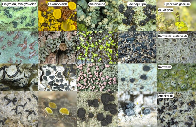 Apotēciji ir dzimumvairošanās augļķermeņi, kuros veidojas sēņu sporas. Tie var būt atvērti un noslēgti. Noslēgtus apotēcijus sauc par peritēcijiem, savukārt atvērtus - par apotēcijiem (piemēri attēlā). Apotēcijus pēc to izskata un uzbūves var iedalīt vairākos veidos: līnijveida, zvaigžņveida, lekanorveida, biatorveida, lecideju tipa, kārpveida, krāterveida, artonijveida, kā arī kātiņveidīgajos. Līnijveida apotēciji ir gareniski izstiepti vai sakopoti zvaigžņveida formās. To vidusdaļas padziļinājumos attīstās sporas. Šāda veida apotēciji raksturīgi rakstu ķērpjiem (Graphis), laiviņķērpjiem (Alyxoria), opegrafām (Opegrapha) un citiem. Lekanorveida apotēcijiem ir labi attīstīta apmale, kas satur aļģes un vienmēr ir tādā pašā krāsā, kā ķērpja laponis, savukārt diska krāsa (apotēcija vidusdaļa) var būt atšķirīgā krāsā. Lecideju tipa apotēciju apmali veido sēņu hifas. Krāsas ziņā apmale sakrīt ar diska krāsu un nesatur aļģes. Šie apotēciji parasti ir melnā krāsā un cieti. Biatorveida apotēciji parasti ir sfēriski, pusapaļi un uzbūves ziņā līdzīgi lecideju tipa apotēcijiem. Tie nekad nav melnā krāsā, bet parasti it rozā, dzeltenīgā, brūnganā, sarkanīgā krāsā. Tie ir samērā mīksti un viegli saspiežami. Kārpveida apotēciju parasti uz lapoņa ir daudz un tie atgādina kārpas vai krāterus, kuros iekšā attīstās sporas. Šāda veida apotēciji raksturīgi pertuzārijām (Pertusaria), telotrēmām (Telothrema), kārpiņu fliktim un citiem. Artonijveida apotēciji ir plāni un pieplakuši laponim. Šādi apotēciji raksturīgi artonijām (Arthonia). Savdabīgi augļķermeņi veidojas nagliņķērpjiem. Tiem raksturīgi kātiņi, kas var būt ļoti īsi, gandrīz nemanāmi, gan arī garāki - līdz 3 mm gari.